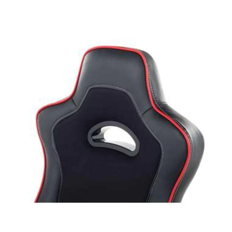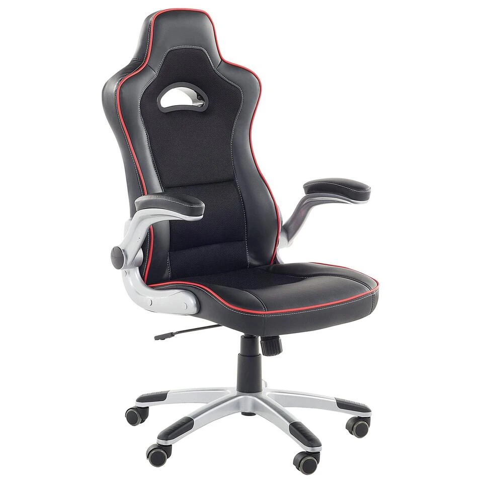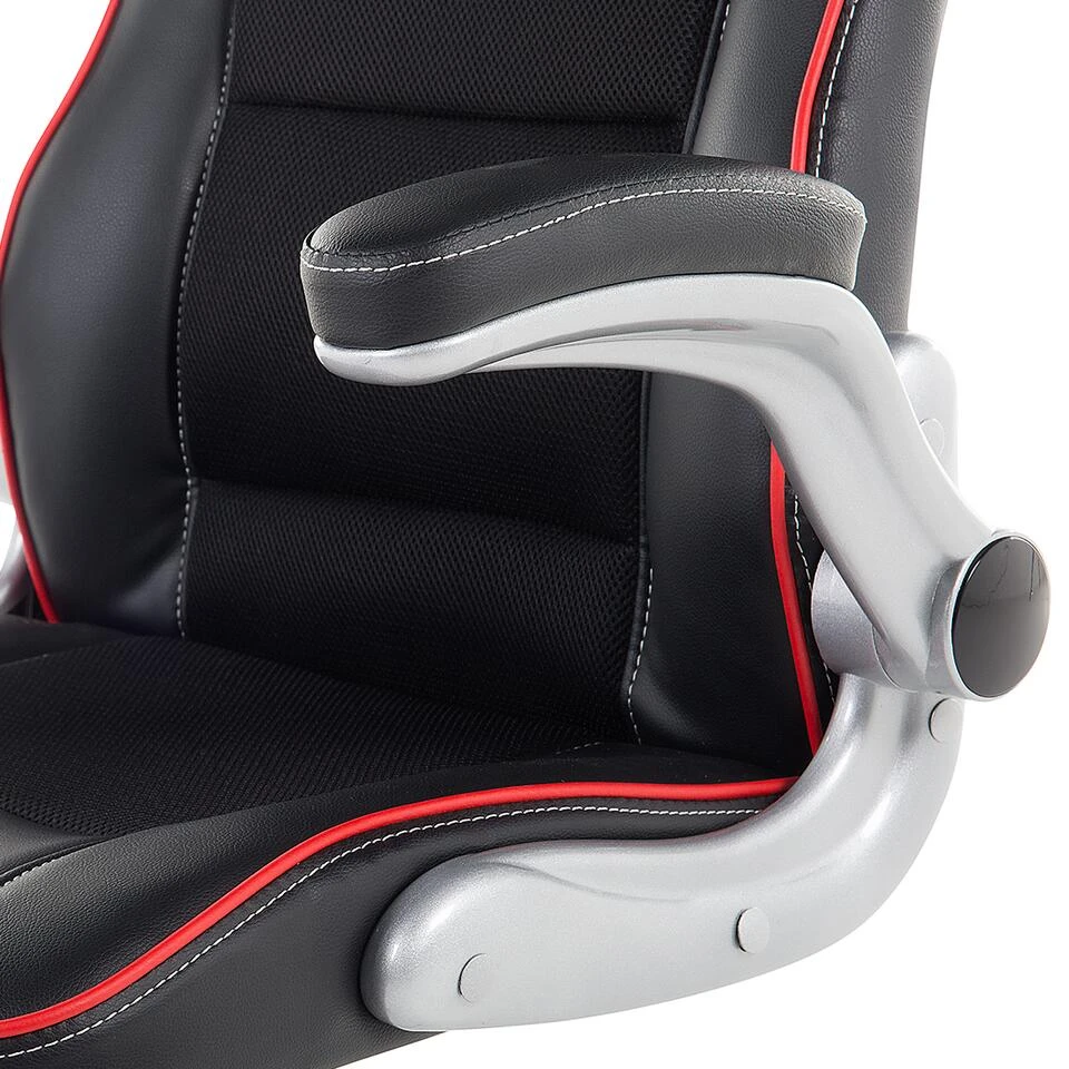 Sportieve, zwarte bureaustoel met mesh-inzet en rood accent. Bent u op zoek bent naar een bureaustoel om comfortabel te lezen of te studeren zonder onaangename rugklachten, dan kan deze stoel een oplossing zijn. Sportief design, een functioneel kantelmechanisme, pneumatische zitting, hoogteverstelling, aangename bekleding, zacht gewatteerde gebogen armleuningen – deze bureaustoel heeft al het nodige en kan ook als gamestoel gebruikt worden.