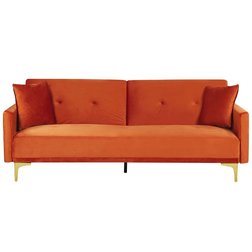 Moderne driezitsbank in elegant oranje. Laat je woonkamer groter en lichter lijken met deze ruimtebesparende en elegante bank. Naast zijn vriendelijke uitstraling scoort hij met hoge functionaliteit: in slechts een paar eenvoudige stappen heb je de bank omgetoverd tot een comfortabel en aangenaam gestoffeerd bed. De hoes is gemaakt van een onderhoudsvriendelijke en slijtvaste stof in oranje. Maak het jezelf gemakkelijk op deze slaapbank. Of je nu tv kijkt of wilt slapen, deze bank is altijd de beste keuze.