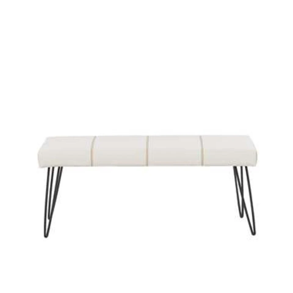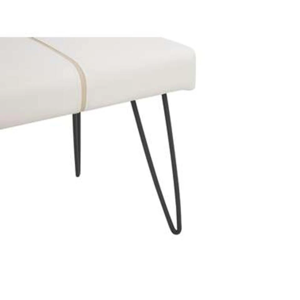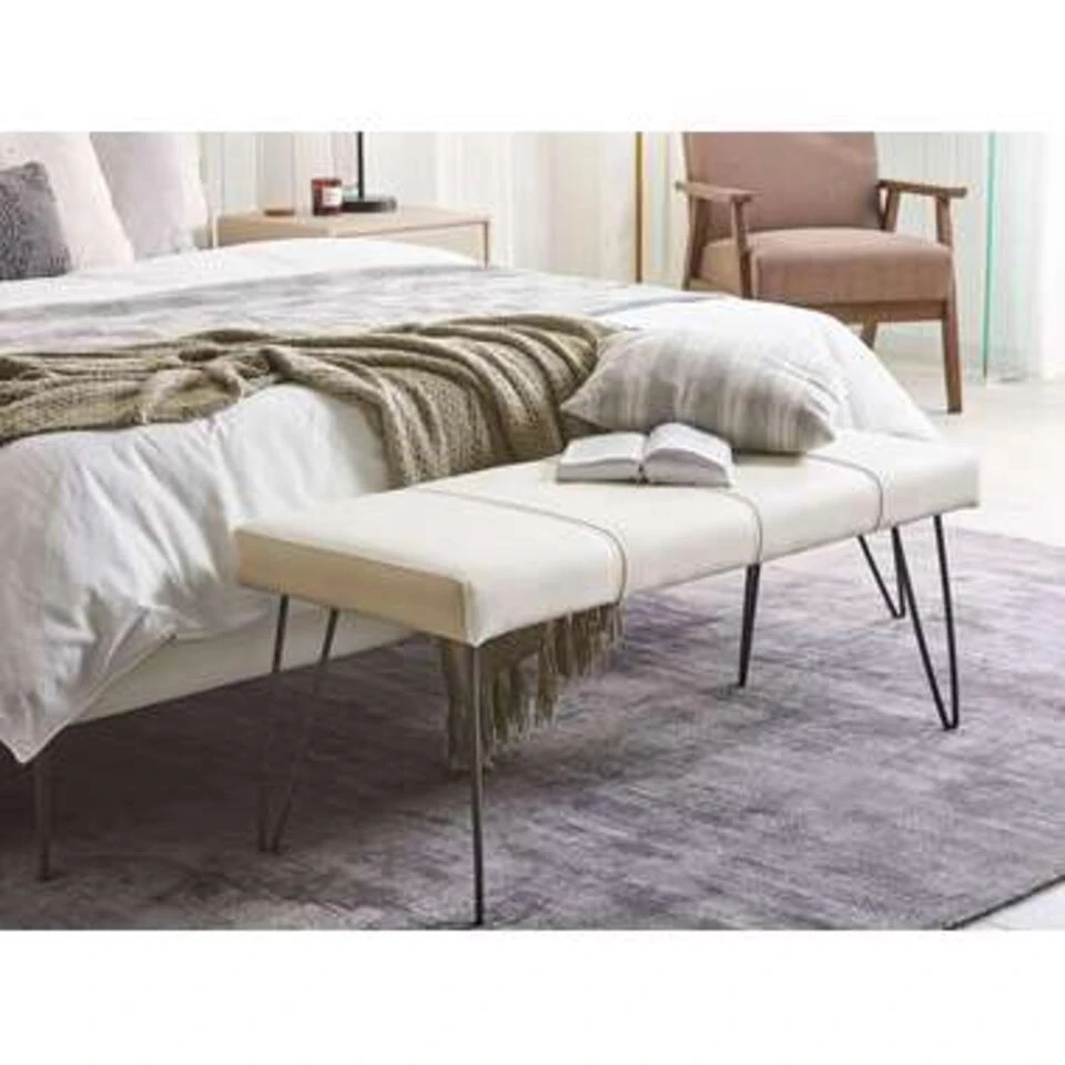 Stijlvolle bank van kunstleer in wit met metalen poten . Een stijlvolle gestoffeerde bank die je woon- of slaapkamer opleukt. Het model is gemaakt van hoogwaardig, synthetisch leer met verticale quilts, wat het buitengewone design van de bank benadrukt. Gebruik het als comfortabele voetensteun, extra zitplaats voor gasten, praktische opbergruimte voor je tablet of boek of als poef naast de bank of bed.