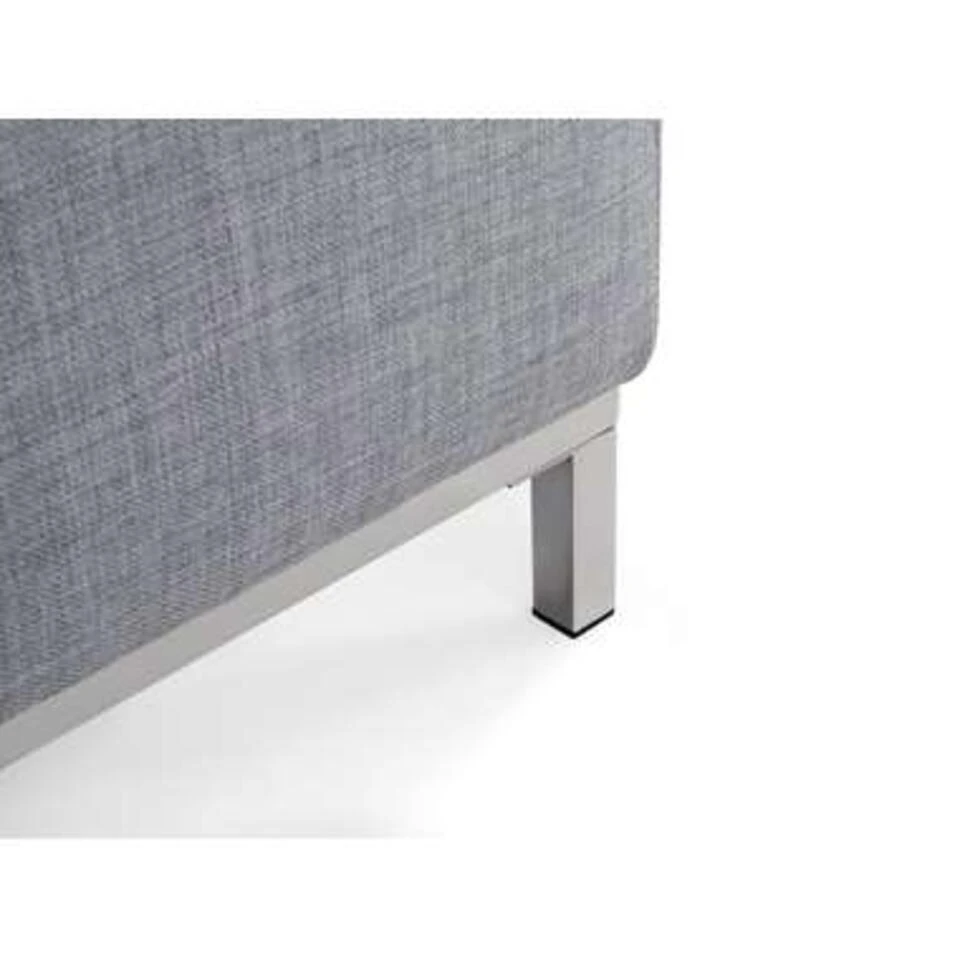 Lichtgrijze, elegante ottomaan. Deze poef is een echt prachtstuk. Je kunt ze in een set kopen met de bank, maar ze zijn vanwege hun populariteit ook afzonderlijk verkrijgbaar. De stevige, duurzame stoffen hoes is zorgvuldig genaaid en strak over de comfortabele voering getrokken. De verchroomde poten geven de ottomaan een modern tintje en vervolledigen het ontwerp.