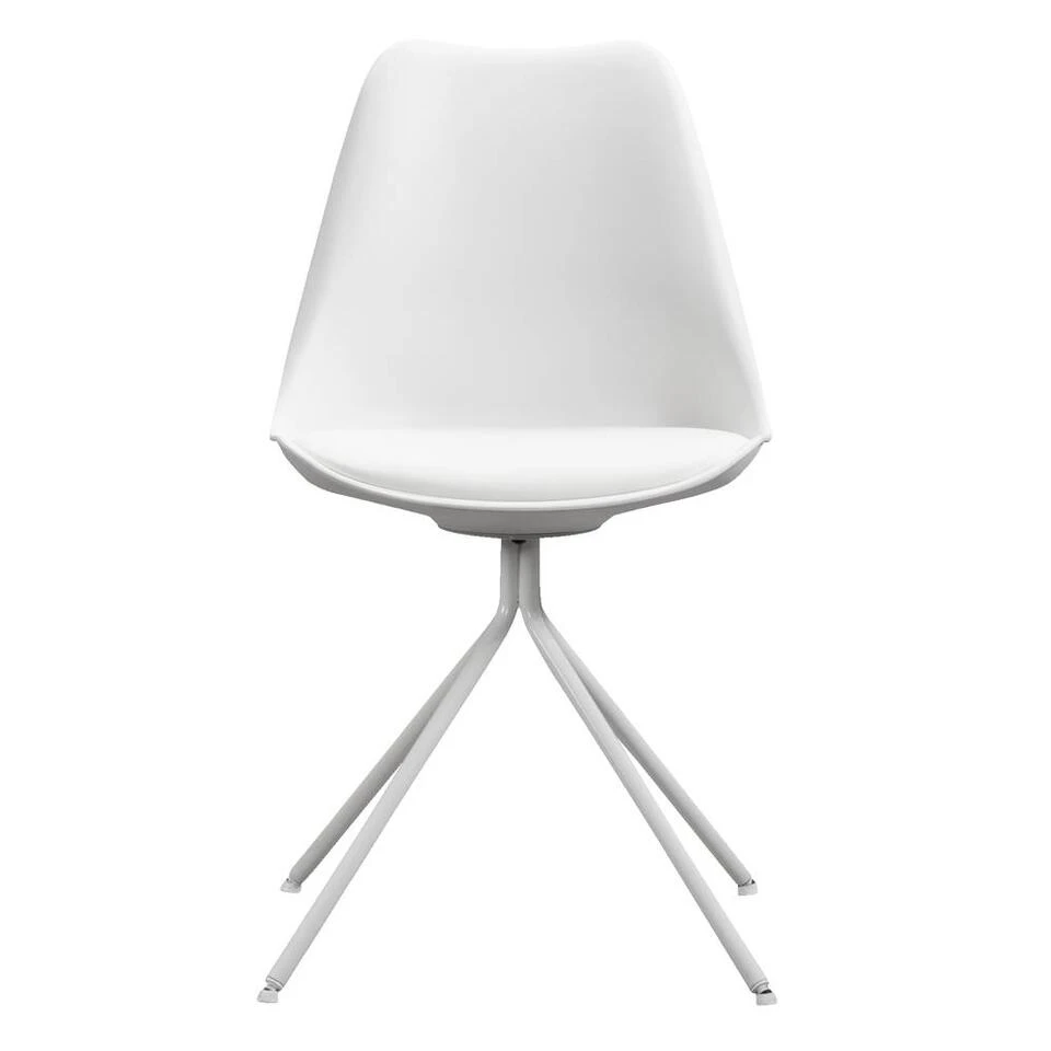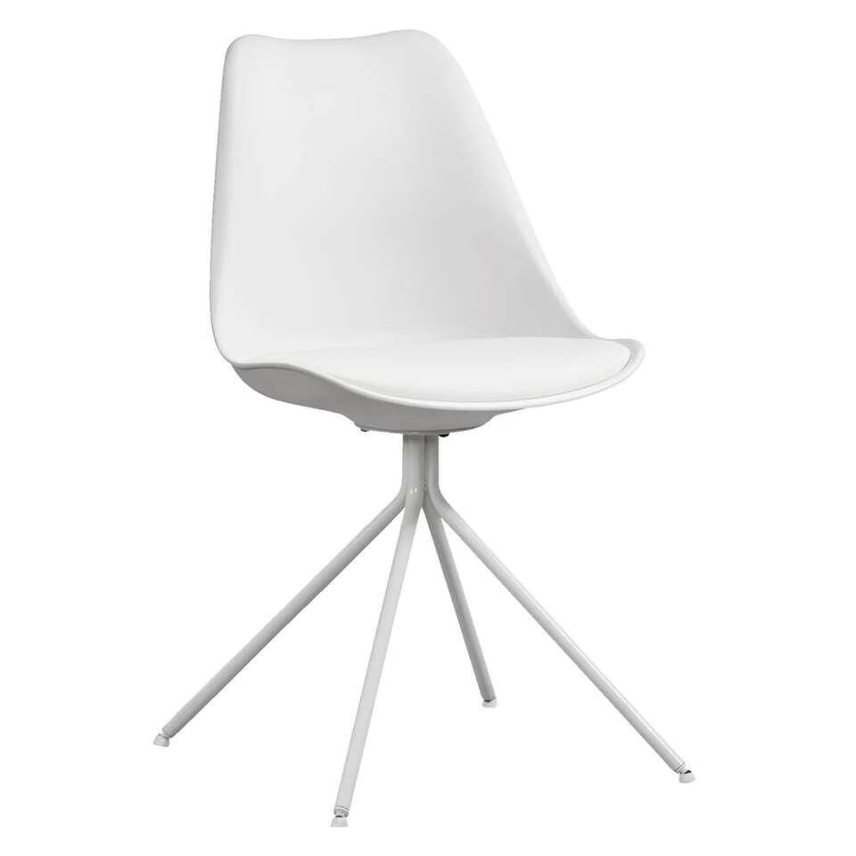 Eetkamerstoel Senja is wit met een wit metalen onderstel. Deze moderne stoel is gemaakt van kunststof, dus gemakkelijk te reinigen met een vochtig doekje.Â